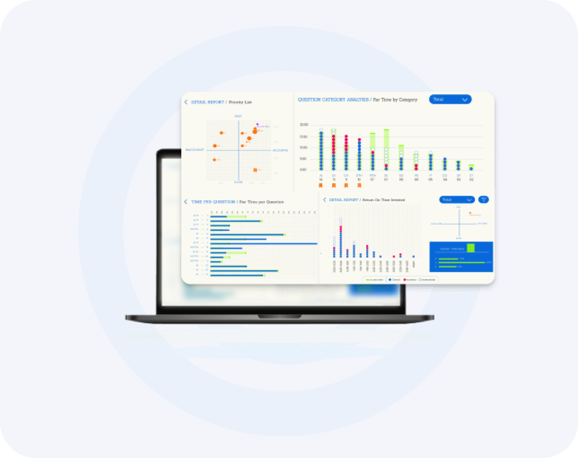 We are analyzing student performance by category, time per question, difficulty level, and target score to give a complete and sophisticated picture of each student's performance. Make your tutor's lives easier by providing intuitive graphic displays that speak volumes at a glance.